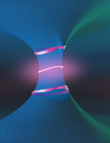 在成对奇异点(exceptional points)(红色)附近所观测到的奇特拓扑景象(粉色线为费米弧,上部和下部的莫比乌斯待为偏振态半核)