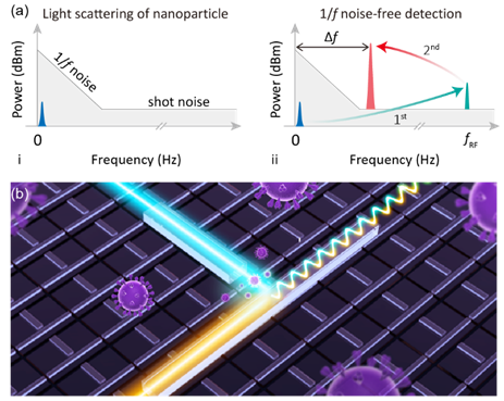 (a) 1/f 噪声抑制机制;(b)基于片上波导暗场外差干涉仪的单颗粒检测