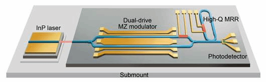 近年来,集成光电子技术的逐步成熟推动了集成微波光子滤波器的快速发展。然而,在此前已报道的研究中,几乎所有集成微波光子滤波器仅实现了无源器件的芯片化,而有源器件(激光器、调制器和探测器)采用仍分立元件,系统体积与稳定性提升有限。世界上首个全集成微波光子滤波器基于铟磷单片集成方法实现,但所达到的滤波性能并不理想,特别是受限于铟磷光波导较大的传输损耗使其滤波精细度差(>2 GHz),远不能满足实际应用要求。
