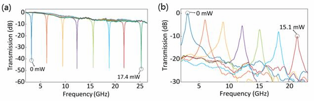 图3. (a) 带阻滤波响应测试结果;(b) 带阻滤波响应测试结果.