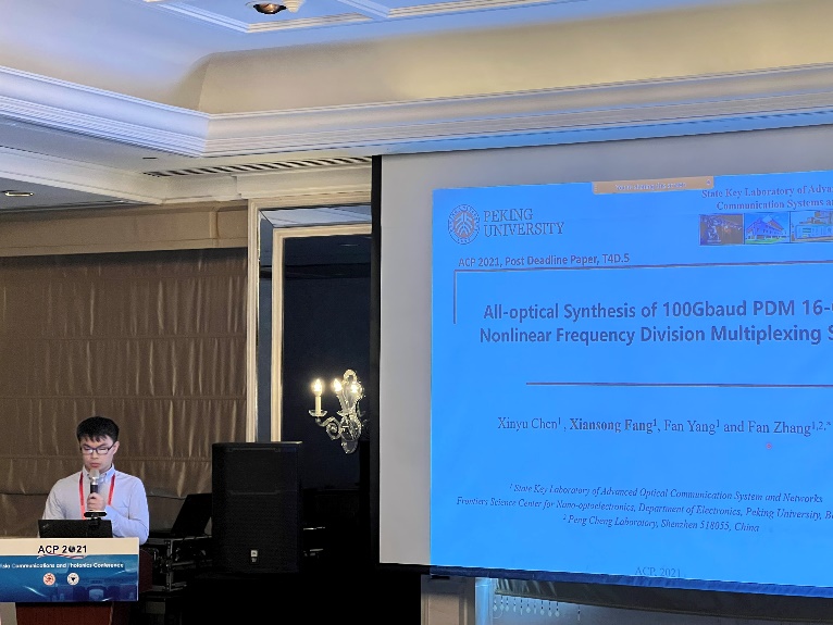 近日,北京大学电子学系区域光纤通信网与新型光通信系统国家重点实验室张帆教授研究团队论文《All-optical Synthesis of 100Gbaud PDM 16-QAM Nonlinear Frequency Division Multiplexing Signal》入选2021年亚洲通信与光子学会议(ACP 2021)PDP论文(Post-deadline paper,报道业界最新技术进展或纪录性成果)。ACP是国际上三大光通信会议之一,本届会议于2021年10月24日—27日在上海举行。