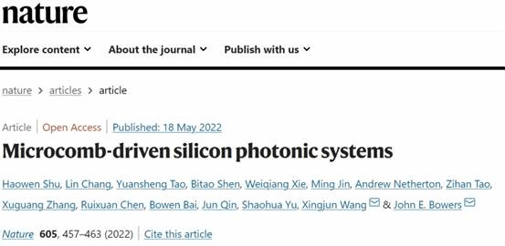 2022年5月19日,区域光纤通信网与新型光通信系统国家重点实验室王兴军教授课题组和加州大学圣芭芭拉分校John E. Bowers教授课题组在Nature杂志在线发表文章“Microcomb-driven silicon photonic systems”。研究团队历时三年协同攻关,世界上首次报道了由集成微腔光梳驱动的新型硅基光电子片上集成系统,攻克了这一世界性难题。