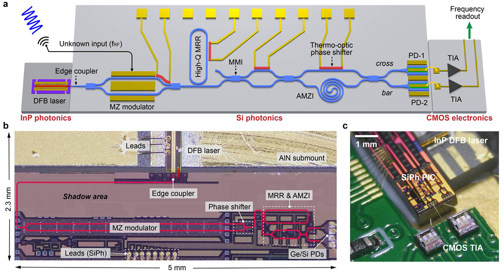 图2. (a)集成微波光子瞬时测频系统的结构图;(b)磷化铟激光器芯片与硅光芯片实物图;(c)系统整体的集成封装实物图。