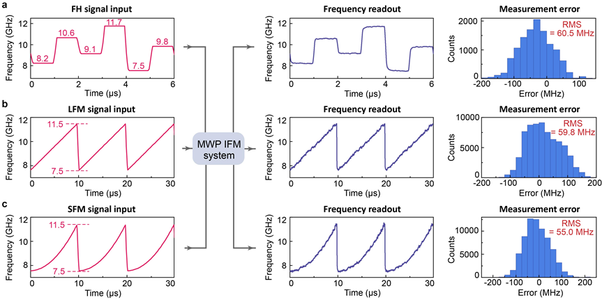 该集成微波光子系统基于频率-光功率映射的工作原理,可实现对超宽频段(2-34 GHz)内微波信号瞬时频率的测量。如图3所示,面向电子对抗、雷达预警等实际应用场景,研究人员们在实验演示了该集成微波光子系统对于微秒级快速时变的跳频、线性调频、二次调频等多种不同格式微波信号频率的实时测量,频率测量误差在55-60 MHz,是迄今为止同类型集成微波光子系统所展示出的最佳性能。本工作所提出的多平台光电混合集成工艺方案,对于研究射频信号产生、信号处理、信号传输等各种类型微波光子系统的集成化、微型化都具有很高的参考价值,为推动微波光子技术的工程化应用提供了一种通用性的解决方案。