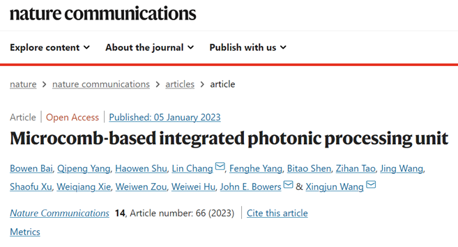 近日,区域光纤通信网与新型光通信系统国家重点实验室王兴军教授课题组-常林助理教授课题组在硅基集成光子处理器方面取得突破性进展。研究团队历时3年,研制出世界上首个基于光子神经网络的超高算力密度硅基集成光子处理器,攻克了多波长并行光计算系统校准和超高精度权重加载两个世界性技术难题。相关成果以“Microcomb-based integrated photonic processing unit”为题于2023年1月5日发表在Nature Communications期刊上。