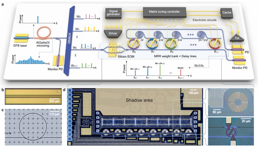为了进一步挖掘光计算潜力,光子神经网络需要通过并行的方式提升计算吞吐量。在光子神经网络中引入波分复用是一种有效手段。然而这种先进的计算架构在集成方面面临巨大的挑战。除了实现集成多波长光源的难度大以外,另一个重要的难点是多波长光子神经网络相比单波长方案系统更复杂,需要更精细的校准方法和更有效的控制手段。因此,长期以来,芯片化一直是制约并行光子神经网络发展的瓶颈,阻碍了相关技术的推广和普及。